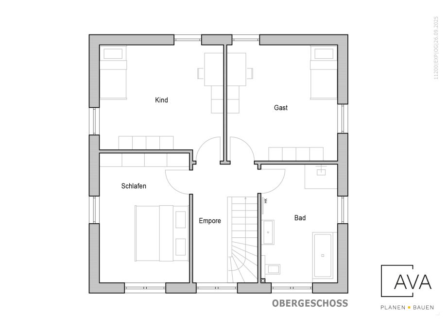 Im Obergeschoss setzen sich die klaren Strukturen weiter fort. Die Empore führt zu drei Räumen, die variabel als Schlaf-, Kinder- oder Gästezimmer genutzt werden können. Zu allen Zimmern im Obergeschoss gehören große Fensterflächen, so dass sich die Räume lichtdurchflutet und freundlich präsentieren.